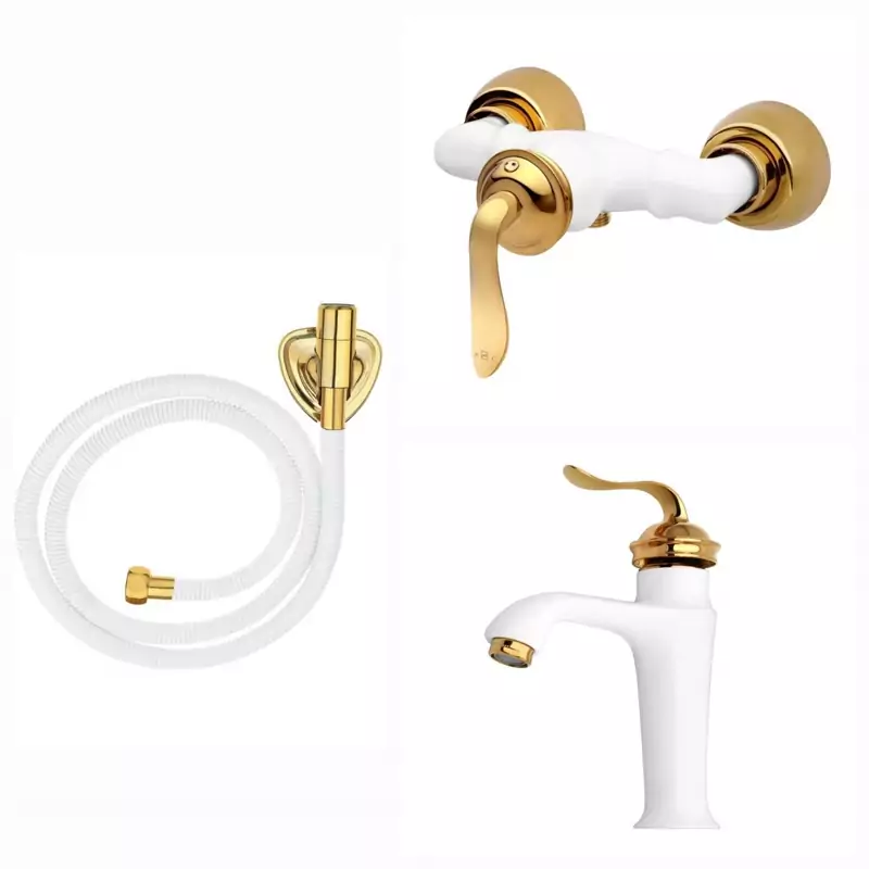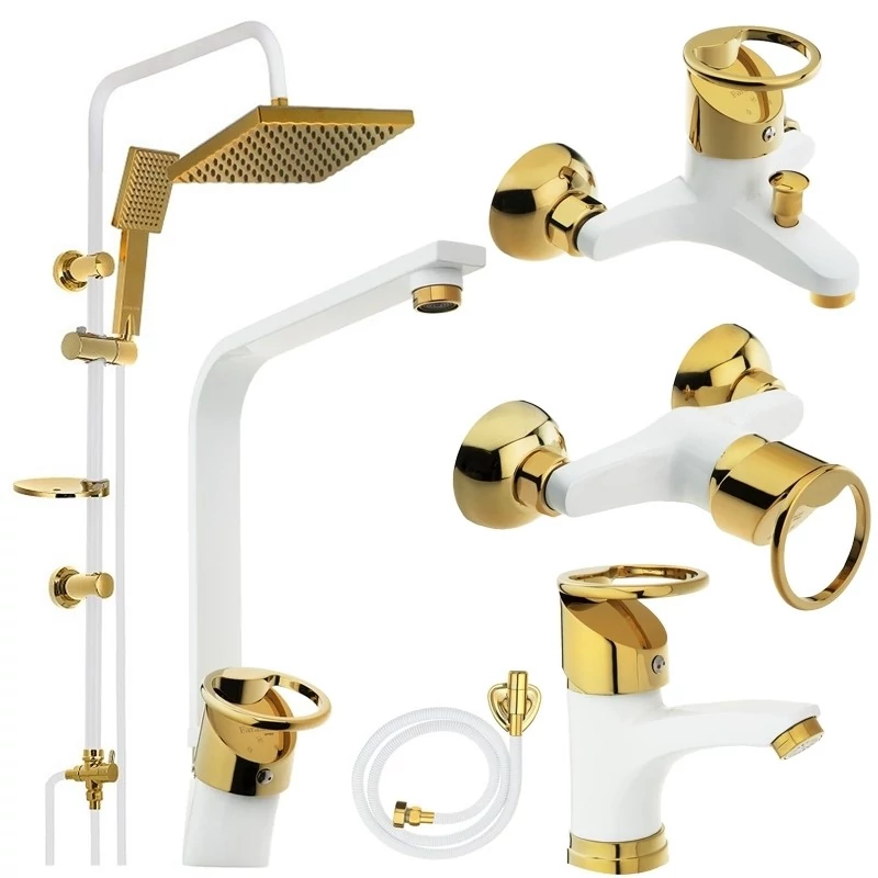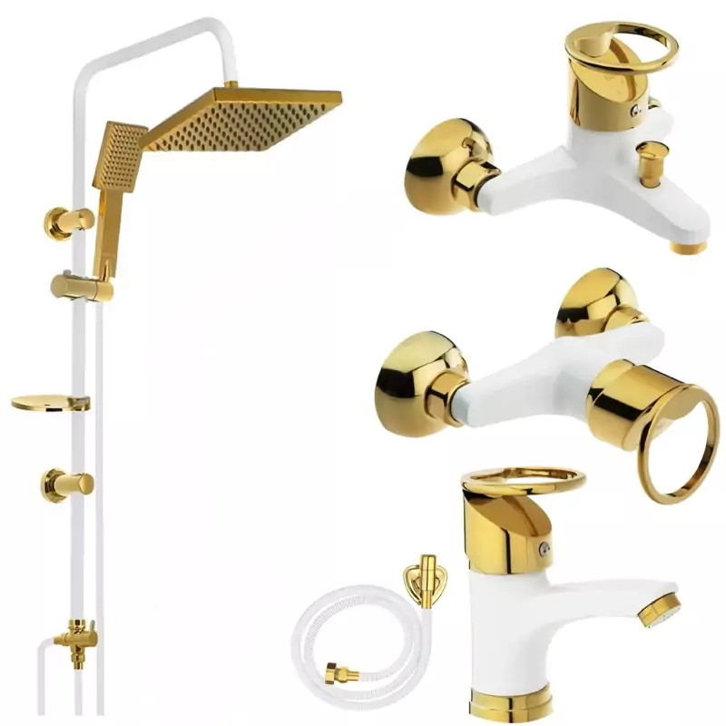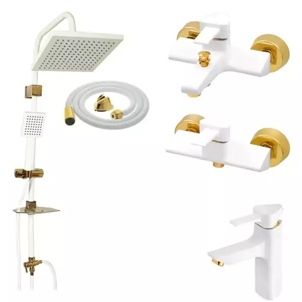 ست شیرالات زحل (مدل هلن فنری سفید طلایی) به همراه روشویی پایه بلند
