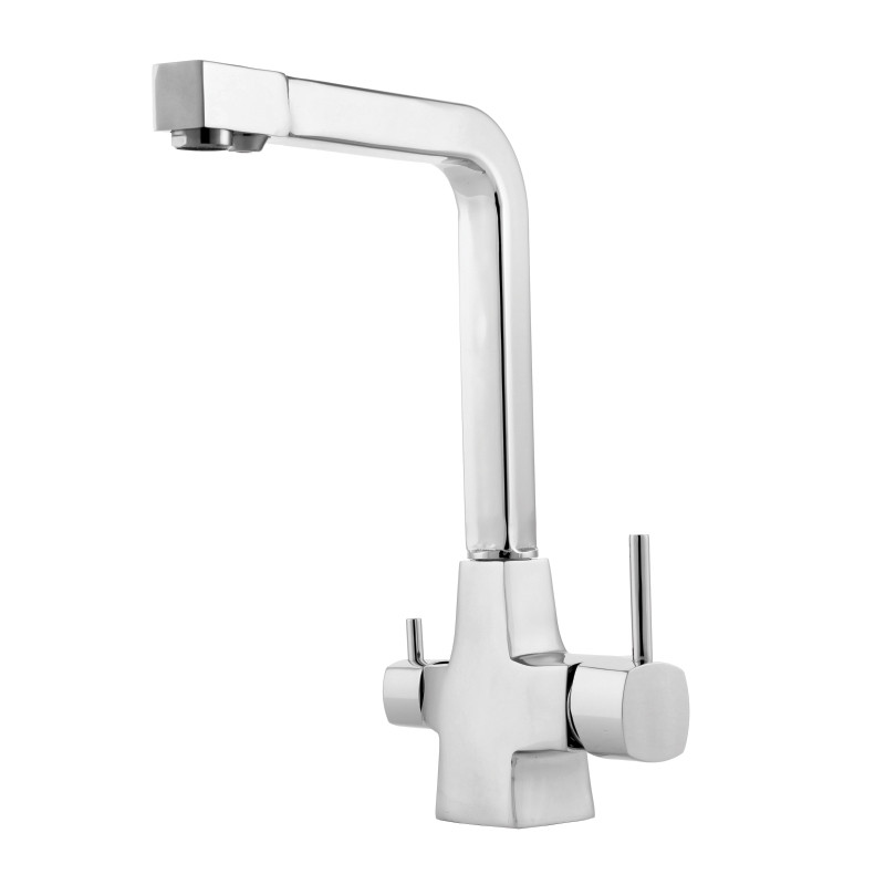 دارای نشان استاندارد ملی ایران x پرلاتور کاهنده مصرف آب برنجی x دارای 2 اهرم و 2 خروجی مجزا جهت اتصال به دستگاه تصفیه آب x علم ریختگی برنجی x پوشش نیکل کروم