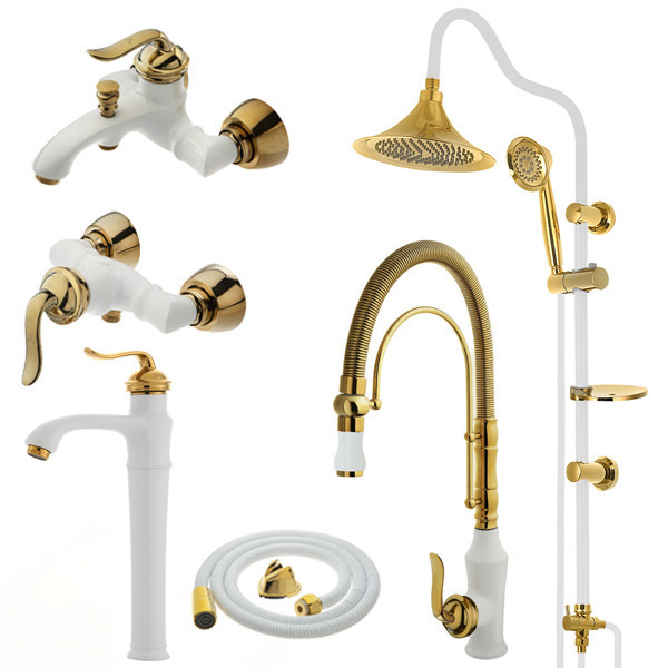 ست شیرالات هلن با روشویی پایه بلند و ظرفشویی فنری سفید طلایی xxx دوش حمام و شلنگ توالت سفید طلایی xxx آچار زیربندی xxx برگه گارانتی