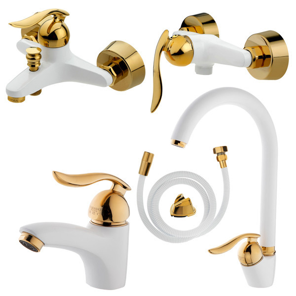 ست شیرالات سام سفید طلایی xxx شلنگ توالت سفید طلایی xxx شلنگ اتصال به شیر پیسوال سایز3/8 xxx آچار زیربندی