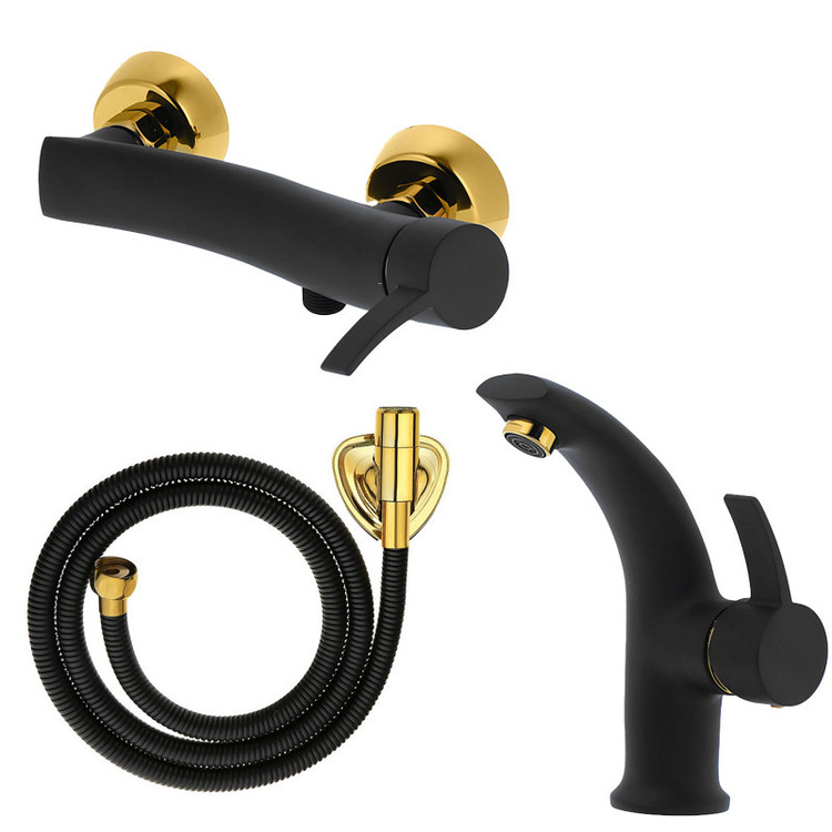 شیر روشویی پایه کوتاه و شیر توالت به همراه شلنگ توالت مشکی طلایی